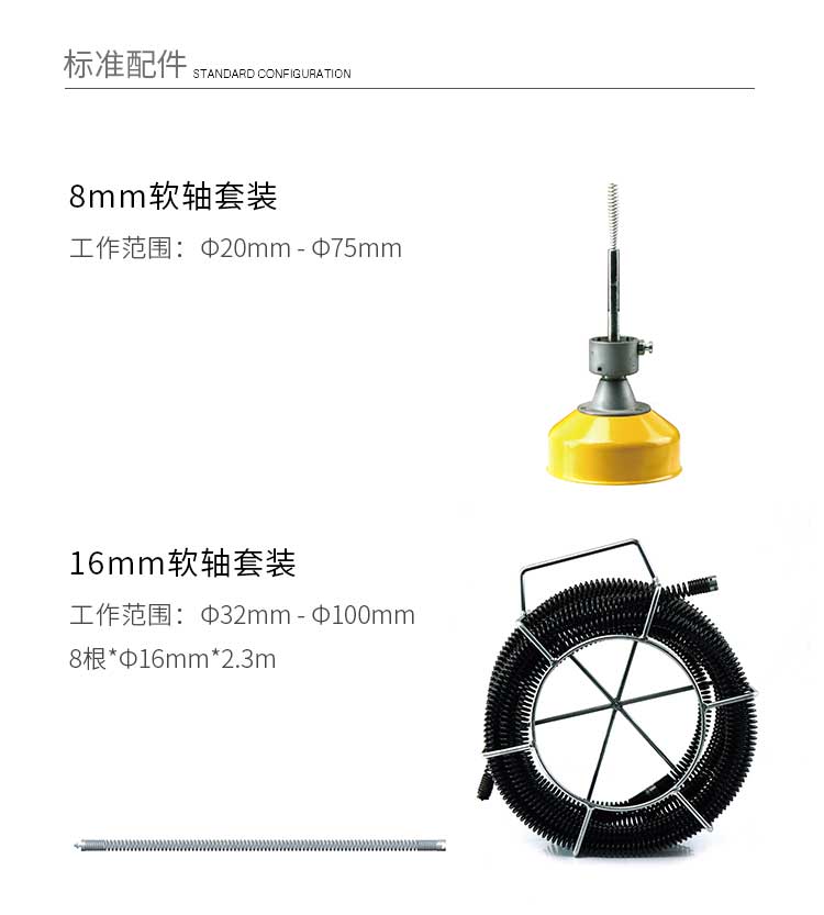 16mm刀頭套裝(活動(dòng)球型刀頭、直螺旋頭刀頭、球型螺旋刀頭、油脂鉆、十字鉆頭、回收鉆、漏斗型刀頭、鯊齒鉆/各1個(gè))、防護(hù)手套1雙、鑰匙1個(gè)、軟軸放置框1個(gè)