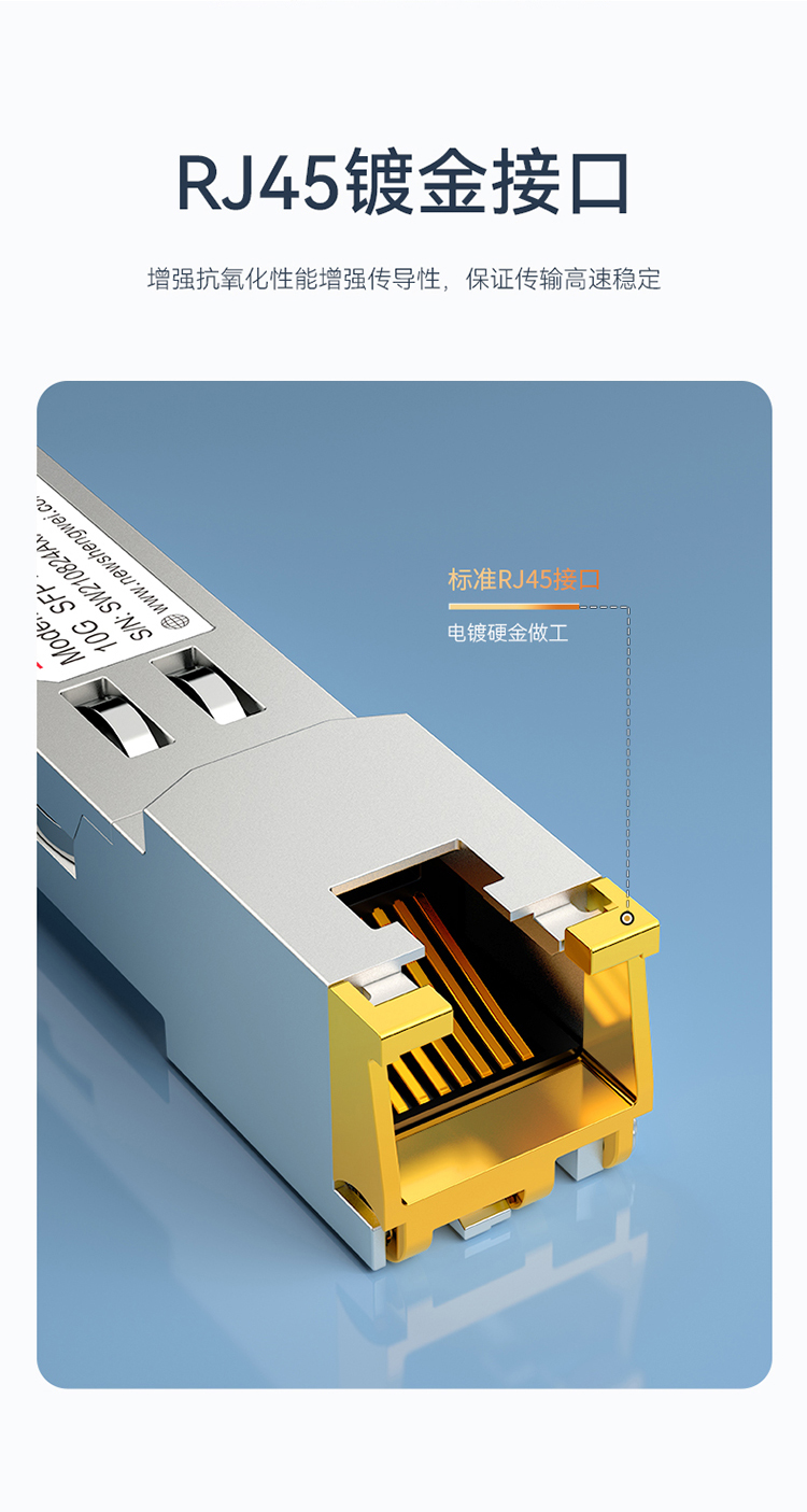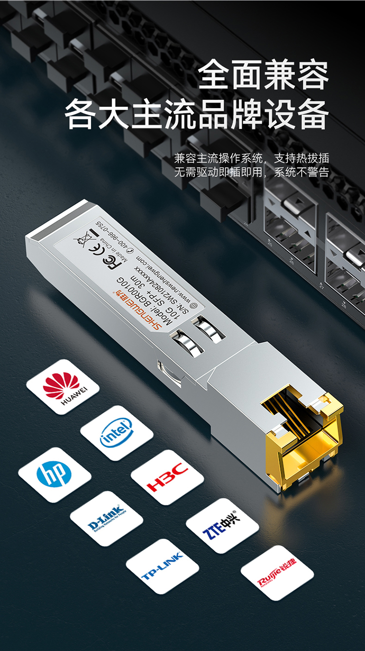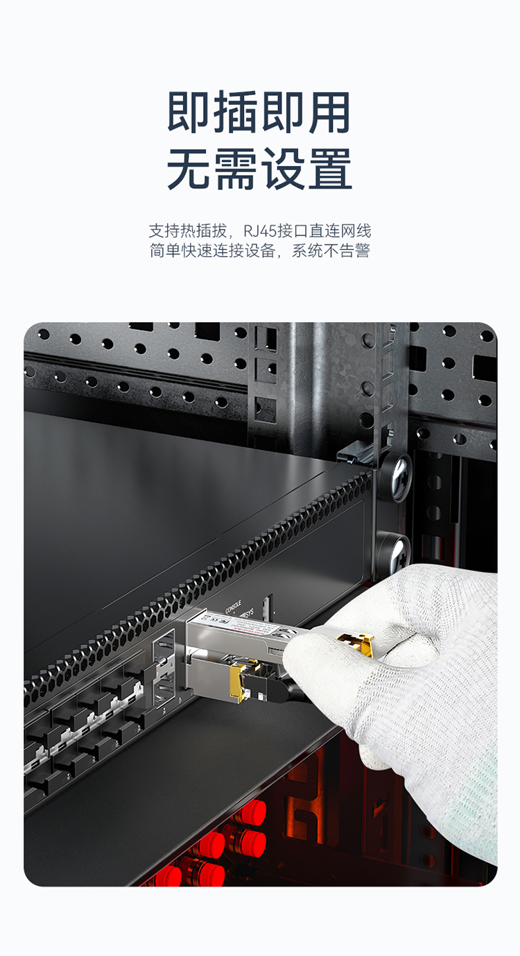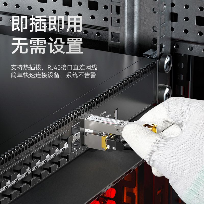 適用于帶SFP光口的交換機、服務器,防火墻、收發器等光纖通訊設備。支持熱插拔,RJ45接口直連網線,簡單快速連接設備,系統不告警。